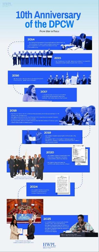2014 онд Сөүл хотноо болсон “Дэлхийн энх тайвны дээд хэмжээний чуулга уулзалт”-аас эхлэлтэй уг ажил нь 2015 онд “Олон улсын энх тайвны эрх зүйн хороо” (ILPC)-г байгуулснаар үргэлжилж, улмаар 10 бүлэг, 38 зүйл бүхий DPCW тунхаглалыг боловсруулан гаргасан түүхтэй.